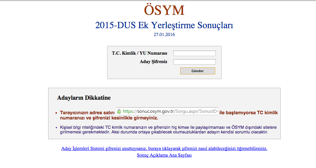 ÖSYM'den yapılan açıklamada, "Ek yerleştirme sonuçları 27 Ocak 2016 günü saat 10.00'dan itibaren ÖSYM'nin https://sonuc.osym.gov.tr İnternet adresinden açıklanacaktır. Adaylar ek yerleştirme sonuçlarını belirtilen İnternet adresinden T.C. Kimlik Numaraları ve şifreleri ile öğrenebileceklerdir. Ek yerleştirme sonuçlarına ilişkin sayısal bilgiler Ek'te verilmiştir. Adaylara saygıyla duyurulur" ifadeleri kullanıldı.
