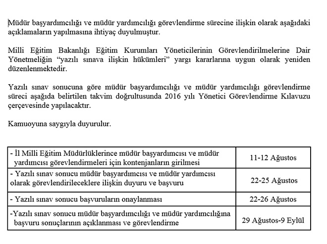 Bakanlığın internet sitesinde, müdür başyardımcılığı vemüdür yardımcılığı görevlendirme sürecine ilişkin duyuru yapıldı. "Milli Eğitim Bakanlığı Eğitim Kurumları Yöneticilerinin Görevlendirilmelerine Dair Yönetmelik'in yazılı sınava ilişkin hükümleri yargı kararlarına uygun olarak yeniden düzenlenmektedir." ifadesine yer verilen duyuruda, yazılı sınav sonucuna göre, müdür başyardımcılığı ve müdür yardımcılığı görevlendirme sürecinin belirtilen takvim doğrultusunda 2016 yılı Yönetici Görevlendirme Kılavuzu çerçevesinde yapılacağı kaydedildi.