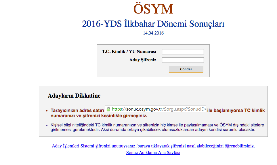 'Yabancı dil sınavına girmiş olan adaylar YDS sonuçlarını ÖSYM'nin resmi internet sitesi üzerinden T.C kimlik numaraları ve şifrelerini girerek çok rahat bir şekilde öğrenebilirler. Adaylar ÖSYM tarafından özel olarak kesinlikle herhangi bir sonuç belgesi gönderilmeyecektir. Adaylar ÖSYM’nin resmi internet sitesi üzerinden TC ve şifrelerini girerek sınav sonuçlarını öğrenebileceklerdir. Yabancı dil sınavının sonuçları 14 Nisan Perşembe günü öğrenci seçme ve yerleştirme merkezi olan ÖSYM tarafından Öğrenci Seçme ve Yerleştirme Merkezi'nin resmi internet adresi üzerinden yayınlandı.
