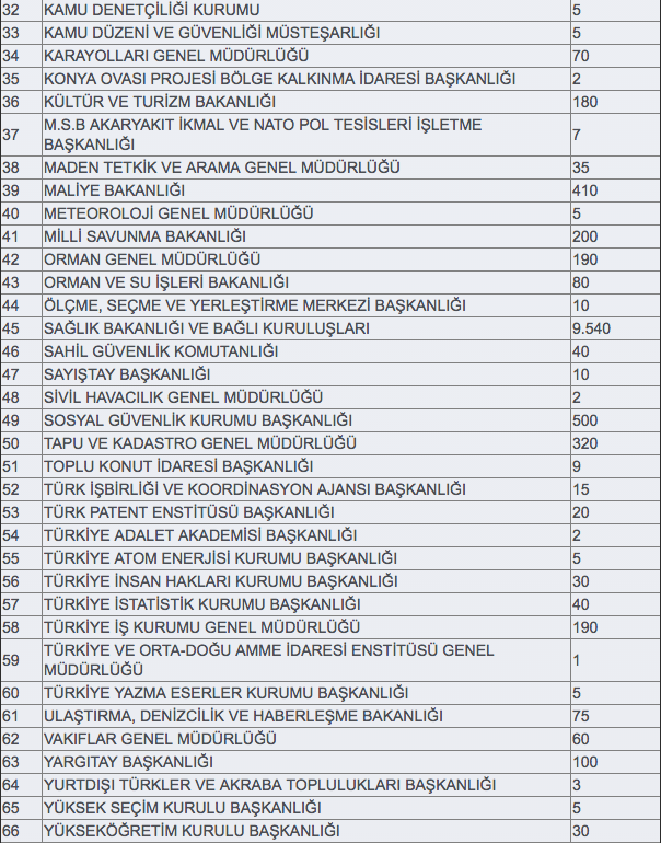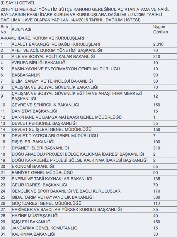 2016 KAMU KURUMLARI ATAMA KONTENJANLARI: