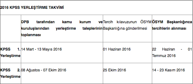 2016 KPSS YERLEŞTİRME TAKVİMİ