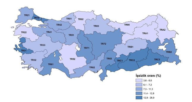 İşsizlik oranı en yüksek bölge %26,9 ile TRC3 (Mardin, Batman, Şırnak, Siirt) iken, işsizlik oranı en düşük bölge %3,6 ile TR90 (Trabzon, Ordu, Giresun, Rize, Artvin, Gümüşhane) oldu.