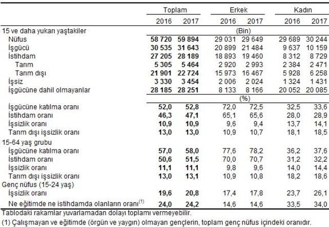 İşgücü 2017 yılında bir önceki yıla göre 1 milyon 108 bin kişi artarak 31 milyon 643 bin kişi, işgücüne katılma oranı ise 0,8 puan artarak %52,8 olarak gerçekleşti. Erkeklerde işgücüne katılma oranı 0,5 puanlık artışla %72,5, kadınlarda ise 1,1 puanlık artışla %33,6 olarak gerçekleşti.