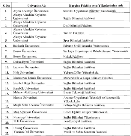 KURULAN FAKÜLTE VE YÜKSEKOKULLARIN LİSTESİ