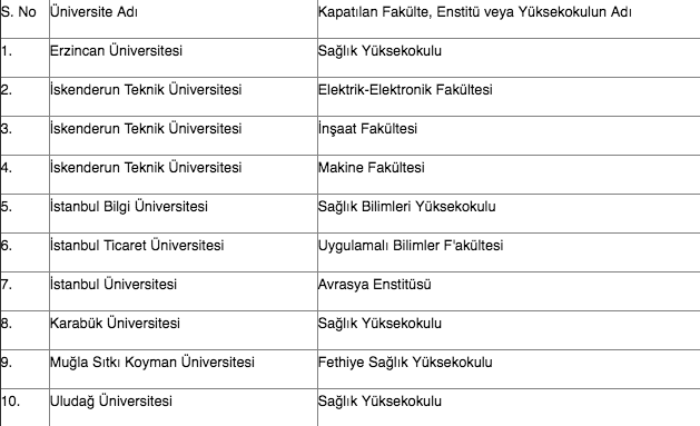 KAPATILAN FAKÜLTE VE YÜKSEKOKULLARIN LİSTESİ