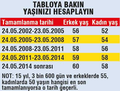 Takvim gazetesinin haberine göre kadınlar 8 Eylül 1981'den önce işe girmiş ise, 3 bin 600 prim gününü tamamlayarak 50 yaşını doldurduktan sonra yaşkademeye bakılmaksızın emekli olabiliyor. Erkekler de 8 Eylül 1976'dan önce ilk defa sigortalı olmuşlarsa, 3 bin 600 prim gününü ve 55 yaşını tamamladığı tarihte emekli olabiliyor. Bu kişiler bu tarihlerle 9 Eylül 1999 arasında işe girmişse şartlar değişiyor.