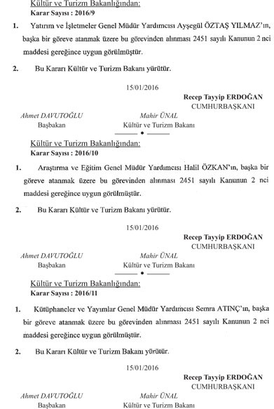 Buna göre; Yatırım ve İşletmeler Genel Müdür Yardımcısı Ayşegül Öztaş Yılmaz, Araştırma ve Eğitim Genel Müdür Yardımcısı Halil Özkan ve Kütüphaneler ve Yayımlar Genel Müdür Yardımcısı Semra Atınç, başka görevlere atanmak üzere görevlerinden alındı.