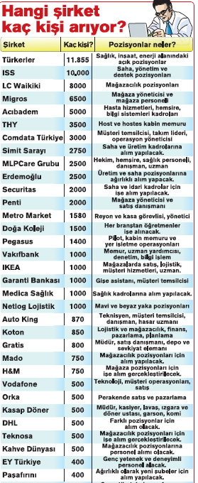 Peki 2018 istihdam anlamında nasıl geçecek? Ekonomist Dergisi bu sorunun cevabını aramak için Türkiye’nin önde gelen şirketini içine alan bir araştırma yaptı. Çıkan sonuç, istihdam artışıyla ilgili ipucu veriyor. Araştırma 50 şirketin gelecek yıl 80 binden fazla personel almayı planladığını ortaya koyuyor. 11 bin 855’le en çok alımı Türkerler Holding yapacak. Ana iş dalı temizlik, güvenlik, hazır yemek olan ISS, 10 bin kişilik alım planıyla ikinci sırada. Onu 8 bin kişiyi işe almayı planlayan LC Waikiki ile 6 bin 500 kişiyi bünyesine katmayı hedefleyen Migros takip ediyor. 2018’de finans sektörünün işe alımlarda durgun bir seyir göstereceği öngörülürken, hızlı tüketim ürünleri pazarında işe alımların her zamanki seyrinde devam etmesi bekleniyor.