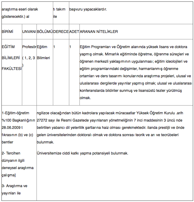 PROFESÖR KADROSU İÇİN ADAYLAR; dilekçesinde başvurmuş olduğu bölümü belirtecek, varsa hizmet belgesi, yayın listesi, resmi kurumlarca onaylanmış öğrenim durumlarını gösterir belgeleri, özgeçmişlerini, bilimsel yayınlarını, kongre ve konferans tebliğleri ile bunlara yapılan atıfları, sanat eserlerini icralarını ve bunlara ilişkin dokümanı eğitim-öğretim faaliyetlerini, yönetimlerinde devam eden ve biten doktora, sanatta yeterlilik veya yüksek lisans (bilim uzmanlığı) çalışmalarını, üniversite veya yüksek teknoloji enstitüsüne katkılarını kapsayan belgeleri ile profesör kadrosuna başvuranlar (yayınlarından birini başlıca araştırma eseri olarak gösterecektir.) altı takım ile başvuru yapacaklardır.