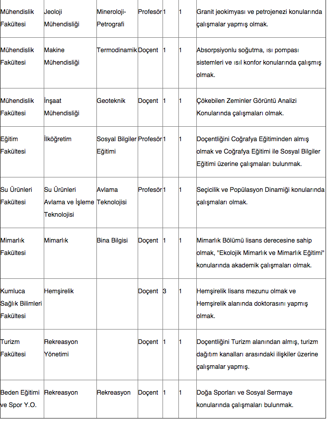 Aşağıda Bölüm ve Anabilim Dallarına adet ve koşulları belirtilen Üniversitemiz Birimlerinde açık bulunan kadrolara 2547 sayılı Yasanın ilgili maddelerine göre Öğretim Üyesi alınacaktır.
