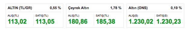 15 Nisan 2016 İstanbul Kapalıçarşı altın fiyatları, 24 Ayar Külçe Altın, 115 liradan alınıyor ve 155,50 liradan satılıyor. 763 liradan alınan Cumhuriyet Ata Lira 777 liradan güne başladı. 104 liradan alınan 22 Ayar Bileziğin gramı 108 liradan satışa sunuldu. 745 liradan alınan Lira (Tam) Ziynet 755 liradan işlem görüyor. 371 liradan güne başlayan Yarım Ziynet 378 liradan günü kapatacak. Çeyrek altın ise 185 liradan alınıyor ve 190 liradan kapalıçarşıda satılıyor. Altının ons fiyatında 1.233 doların üzerinde kalındığı sürece 1.233 dolar direncinin gündeme gelebileceğini net bir şekilde görülebiliyor.