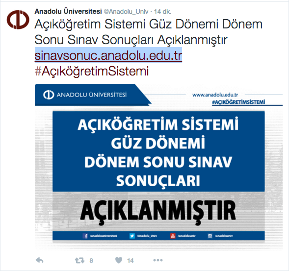 'AÖF sınav sonuçları açıklandı' bilgisi Anadolu Üniversitesi'nin resmi Twitter adresinden böyle duyuruldu: