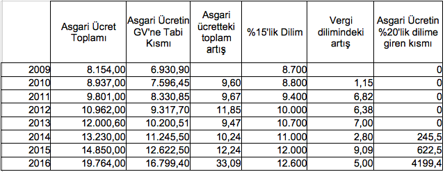 Yukarıdaki tablodan görüleceği üzere asgari ücretin yüzde 20'lik gelir vergisi dilimine girme sorunu 2014 yılından bu yana ortaya çıkan bir sorundur. 2014-2015 yıllarında Aralık ayında yüzde 20'lik vergi dilimine girilmiş, nihayet 2016 yılındaki sıra dışı artış nedeniyle Ağustos değil Ekim ayında yüzde 20'lik vergi dilimine girmiş olacaktır. Ekim-Aralık 2016 ayları arasında asgari ücretliden yüzde 20 gelir vergisi tahsil edilmiş olacaktır.