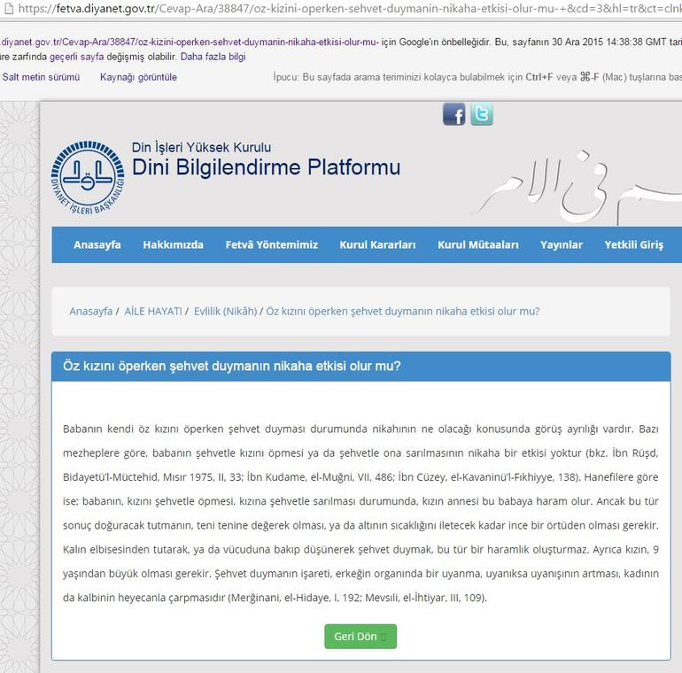 Diyanet İşleri Başkanlığı adına fetva veren kurum olarak bilinen “Din İşleri Yüksek Kurulu Dini Bilgilendirme Platformu,” resmi internet sitesine gelen “Öz kızını öperken şehvet duymanın nikaha etkisi olur mu?” şeklindeki soruya verdiği cevapla sosyal medya tarafından topa tutuldu? Platform, verdiği cevabın sosyal medyada sert tepkilere neden olmasının ardından hem soruyu hem de verdiği yanıtı kaldırdı.