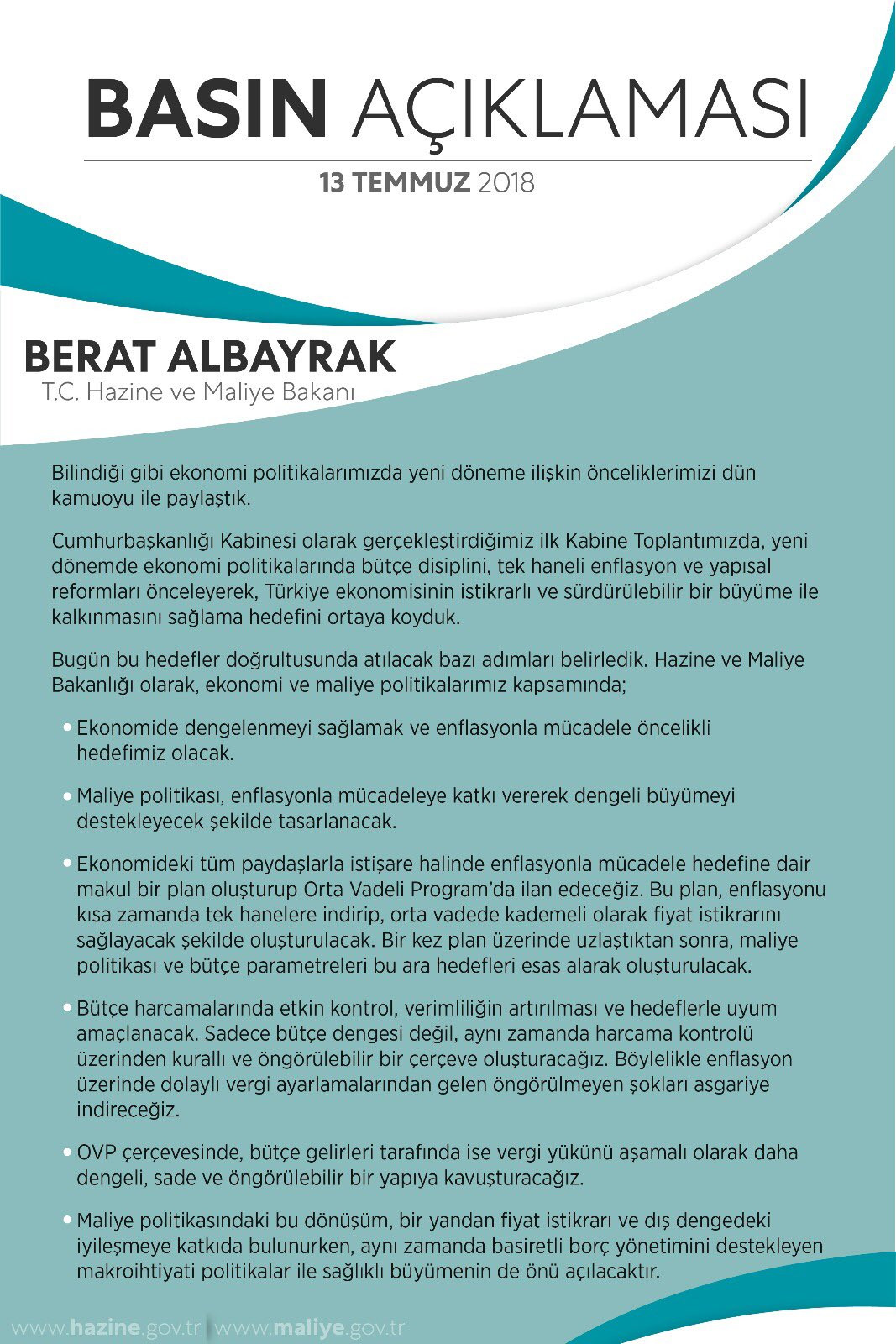 *Cumhurbaşkanlığı Kabinesi olarak gerçekleştirdiğimiz ilk Kabine Toplantımızda, yeni dönemde ekonomi politikalarında bütçe disiplini, tek haneli enflasyon ve yapısal reformları önceleyerek, Türkiye ekonomisinin istikrarlı ve sürdürülebilir bir büyüme ile kalkınmasını sağlama hedefini ortaya koyduk