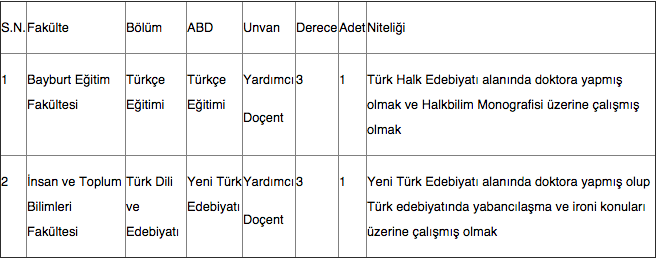 Bayburt Üniversitesi öğretim üyesi alım ilanı