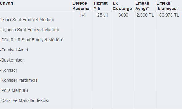 Emniyet personeli hakkında geçerli olan belirlemelere göre, “İkinci Sınıf Emniyet Müdürü” ile “Çarşı ve Mahalle Bekçisi” unvanlı kadrolardan emekli olanların alacakları emekli aylığı ve emekli ikramiyesinin miktarı aynı seviyede bulunuyor.