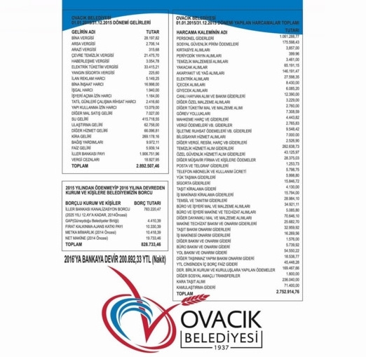 Tunceli’nin Ovacık ilçesi belediye başkanı Fatih Mehmet Maçoğlu, belediyenin 1 yıllık gelir ve gider tablosunu afiş yaparak belediye binasına astırdı!