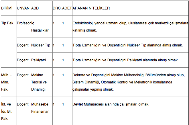 Üniversitemizin aşağıda belirtilen birimine, 2547 sayılı Yükseköğretim Kanunu, Öğretim Üyeliğine Yükseltilme ve Atanma Yönetmeliği, Üniversitemiz web sayfasında yayınlanan Akademik Yükseltilme ve Atanma Ölçütlerinin ilgili maddeleri ve 657 sayılı Devlet Memurları Kanununun 48. maddesinde belirtilen şartları sağlayanlardan Öğretim Üyesi alınacaktır.