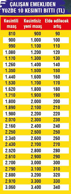 Emekli aylığı almaya başladıktan sonra kendi nam ve hesabına çalışanların maaşlarından daha önce yüzde 15 kesinti yapılıyordu. Hükümet, geçtiğimiz yıl bu kesintiyi yüzde 10'a indirmişti. Bu yıl da çıkarılan yasayla kesinti tamamen kaldırıldı. Bu düzenleme ile 655 bin emekli gelir artışı elde etti. Çalışma ve Sosyal Güvenlik Bakanı Süleyman Soylu'nun yaptığı açıklamaya göre; kesintinin kaldırılmasıyla emekli aylıklarında yaklaşık 63 ile 345 lira arasında artış gerçekleşti.