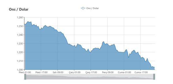 Spot altının ons fiyatı yüzde 0.8 kayıpla 1,202.80 dolardan işlem görürken, erken seans saatlerinde 1,199.60 dolara kadar düşerek 17 Şubat'tan bu yana en düşük seviyeyi gördü.