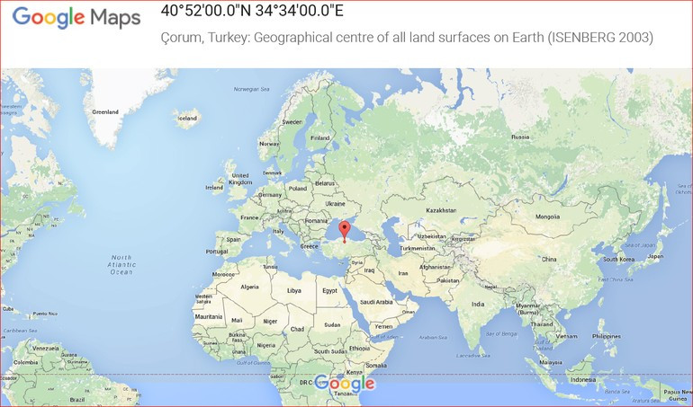 Dünyanın en çok kullanılan internet arama motoru Google’ın haritalama servisi Google haritaların ‘dünyanın coğrafi merkezini Çorum kırsalını oluşturan bölge olarak açıkladığı’ iddia edildi.