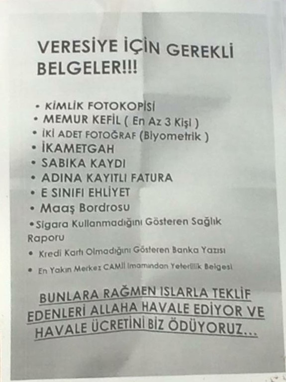 Veresiye için gerekli belgeler listesinde 11 zorunlu evrak istenirken dikkat çeken listede sırası ile şu evraklar yer aldı: Kimlik fotokopisi, en az 3 kişi memur kefili, 2 adet biyometrik fotoğraf, ikametgah, sabıka kaydı, adına kayıtlı fatura, E sınıfı ehliyet, maaş bordrosu, sigara kullanmadığını gösteren sağlık raporu, kredi kartı olmadığını belgeleyen banka yazısı, en yakın merkez cami imamından yeterlilik belgesi.