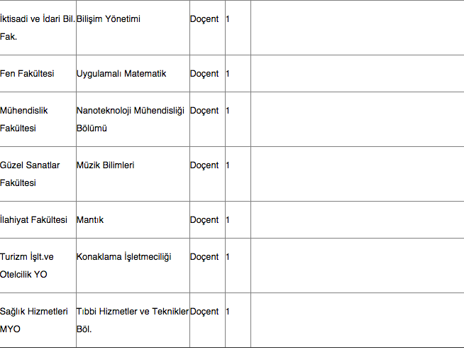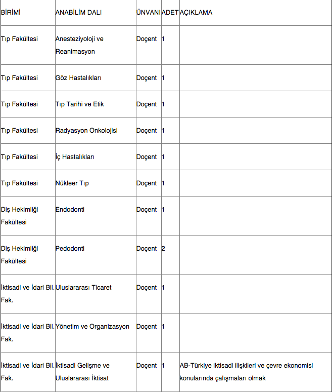 Üniversitemizin aşağıda yazılı birimlerine 2547 sayılı Kanun'un ilgili maddeleri gereğince Doçent alınacaktır. Adayların ilanın yayım tarihinden itibaren 15 gün içerisinde Rektörlüğe başvurmaları ve Üniversitemiz web sitesinde yayınlanan Akademik Personel Yükseltilme/Atanma Başvuru ve Değerlendirme Koşullarını sağlıyor olmaları gerekmektedir.