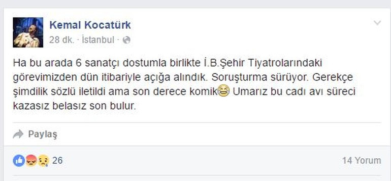 Oyuncu ve yönetmen Kocatürk, açığa alındığını resmi Facebook hesabından duyurdu. Tek kişilik; Orhan Veli, Ahmet Arif, Can Yücel oyunlarıyla tanınan Kemal Kocatürk, "Ha bu arada 6 sanatçı dostumla birlikte İ.B.Şehir Tiyatrolarındaki görevimizden dün itibariyle açığa alındık. Soruşturma sürüyor. Gerekçe şimdilik sözlü iletildi ama sonderece komik" dedi.