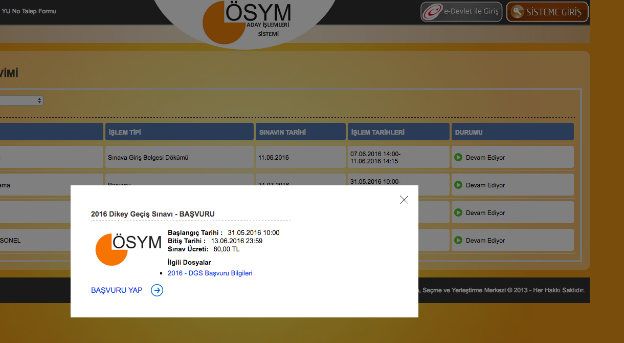 2016 yılında DGS ücreti 80 TL olarak belirlendi.