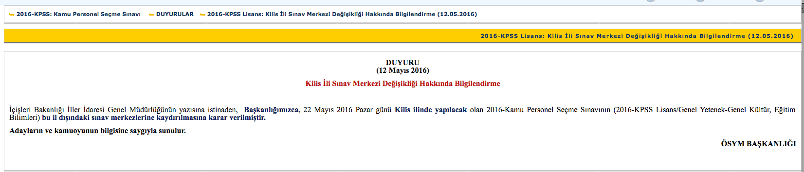 Duyuruda, İçişleri Bakanlığı İller İdaresi Genel Müdürlüğünün yazısına istinaden, 22 Mayıs 2016 Pazar günü yapılacak 2016-KPSS lisans/genel yetenek-genel kültür, eğitim bilimleri sınavlarının Kilis'teki oturumlarının il dışındaki sınav merkezlerine kaydırılmasının kararlaştırıldığı belirtildi.