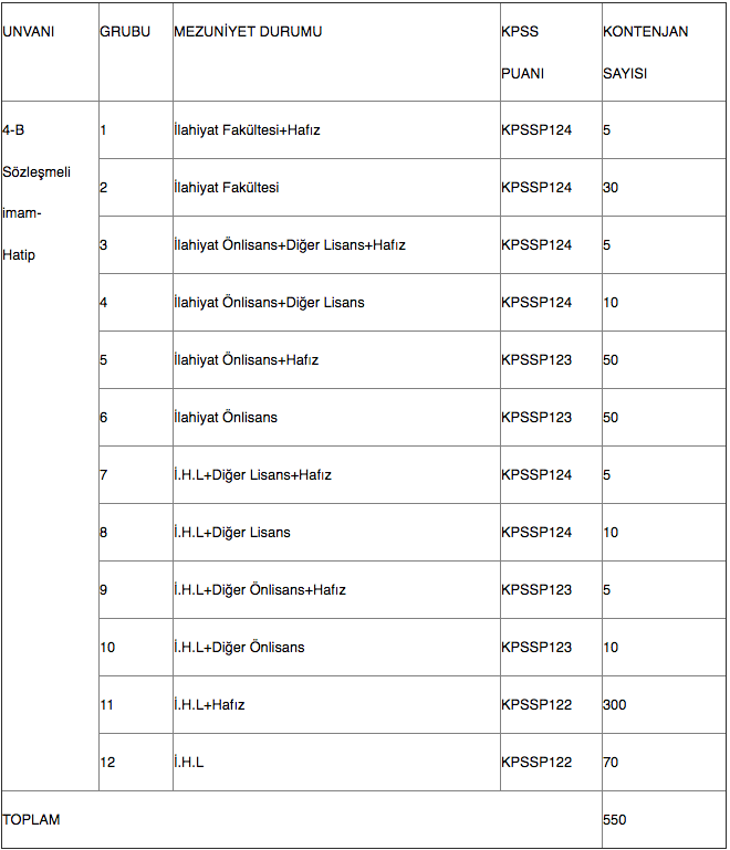 Başkanlığımız taşra teşkilatındaki sözleşmeli imam-hatip pozisyonlarına; 2014 yılı KPSS puan sırası esas alınarak her bir grup için tabloda belirtilen boş kadro sayısının üç (3) katına kadar çağrılacak adaylar arasından sözlü sınav sonucu başarı sırasına göre 4-B sözleşmeli imam-hatip alınacaktır.