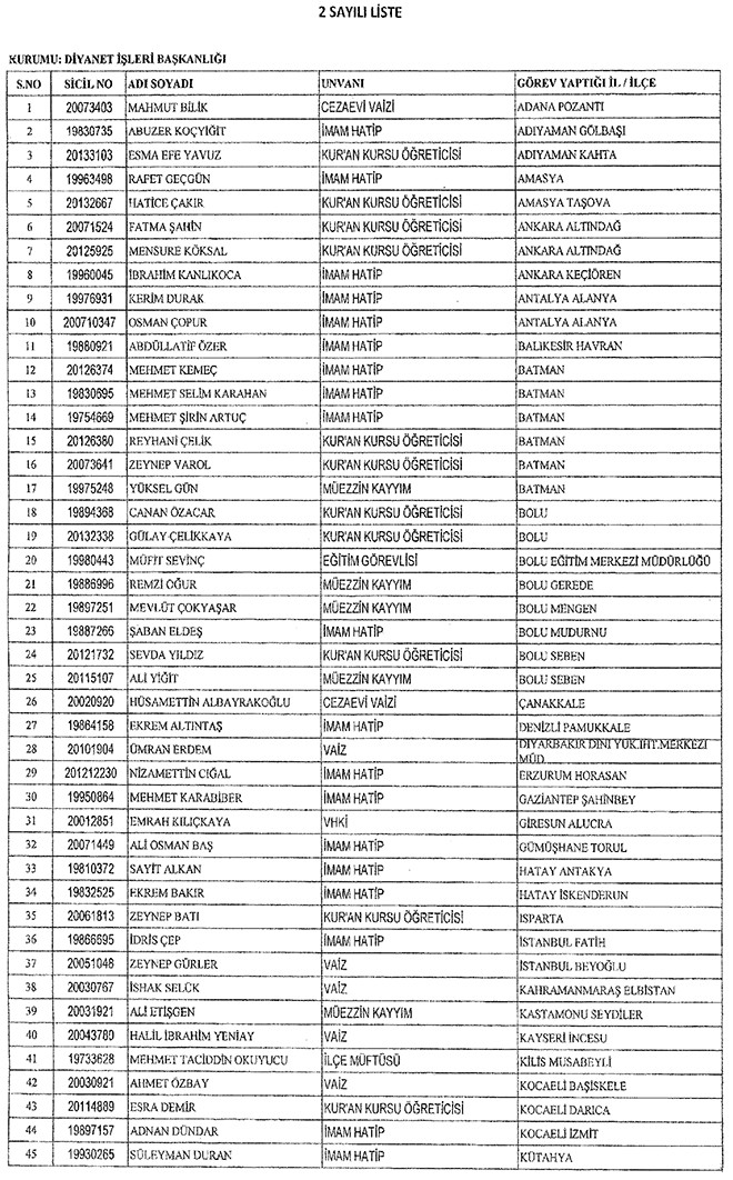 İŞTE DİYANET İŞLERİ BAŞKANLIĞI'NDA GÖREVE İADE EDİLENLERİN LİSTESİ
