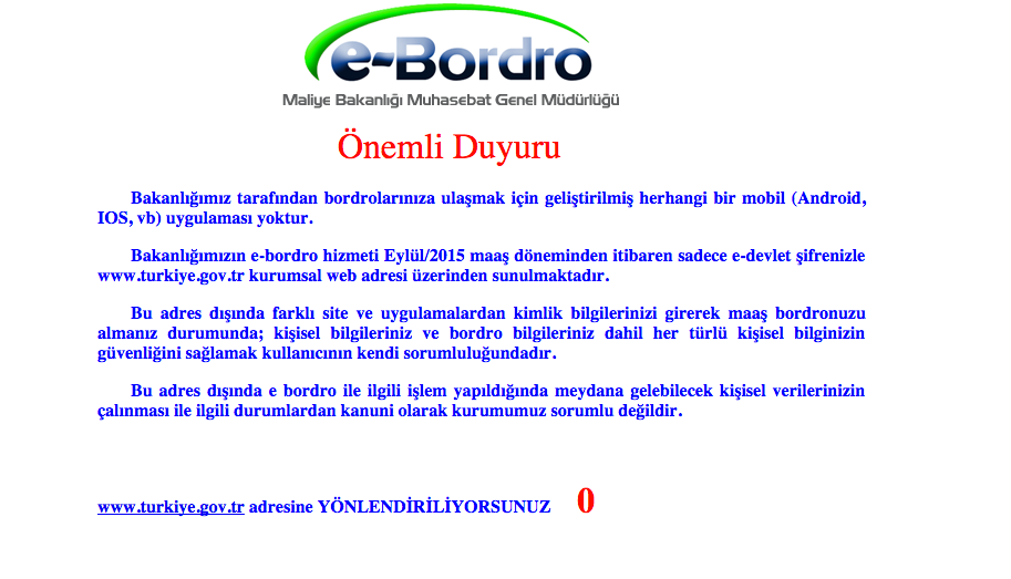 Bakanlığımız tarafından bordrolarınıza ulaşmak için geliştirilmiş herhangi bir mobil (Android, IOS, vb) uygulaması yoktur. Bakanlığımızın e-bordro hizmeti Ocak/2016 maaş döneminden itibaren sadece e-devlet şifrenizle www.turkiye.gov.tr kurumsal web adresi üzerinden sunulmaktadır.