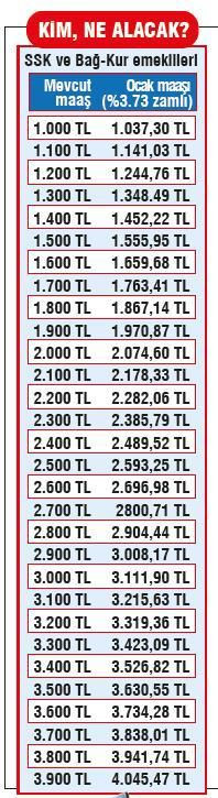 Bu tahmin gerçekleşirse, 2016'nın ikinci 6 aylık dönemindeki enflasyon yani SSK ve Bağ-Kur emeklilerinin Ocak zammı yüzde 3.73 olacak. TAKVİM, bu tahmine göre emeklilerin Ocak maaşlarını hesapladı. Türkiye Emekliler Derneği (TÜED) verilerine göre; halen en düşük maaş 2000'den önce SSK'dan emekli olanlarda bin 339 lira, sonra emekli olan SSK'lılarda 798 lira, Bağ-Kur esnaf emeklilerinde bin 163 lira, Bağ- Kur tarım emeklilerinde ise 916 lira seviyesinde bulunuyor. Ocak zammının yüzde 3.73 olması halinde en düşük maaş; 2000 yılından önce emekli olan SSK'lılarda bin 389 lira, 2000'den sonra emekli olan SSK'lılarda 828 lira, Bağ-Kur esnaf emeklilerinde bin 206 lira, Bağ- Kur tarım emeklilerinde ise 950 liraya yükselecek.