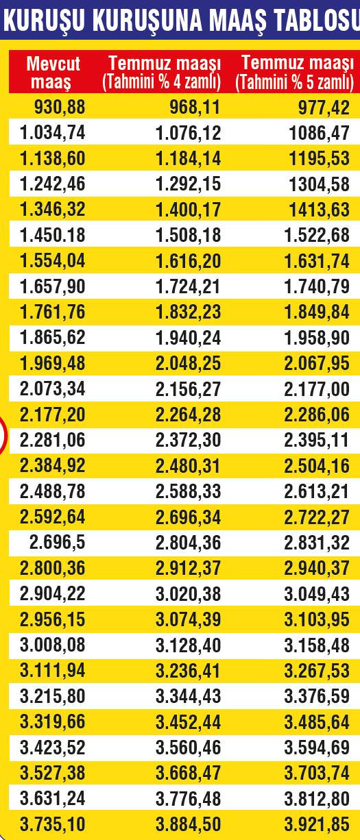 En yüksek emekli aylığı ise 3 bin 814 lira. Bu maaş Temmuz zammının yüzde 4 olması ile 3 bin 966 lira 56 kuruşa, yüzde 5 çıkması halinde ise 4 bin 4 lira 70 kuruşa ulaşacak. Bu maaş yüzde 4 zamla 152 lira 56 kuruş, yüzde 5 artışla 190 lira 70 kuruş yükselecek..