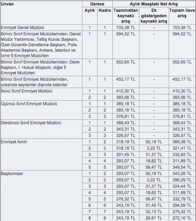 - Genel Müdür Yardımcısı, Teftiş Kurulu Başkanı, Özel Güvenlik Denetleme Başkanı, Polis Akademisi Başkanı, Ankara, İstanbul ve İzmir İl Emniyet Müdürleri için %356’sına,