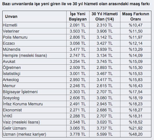 Ancak, işe yeni başlayanlar ile aynı unvanda 30 hizmet yılı ile en üst seviyeye ulaşmış bulunan memurlar arasındaki maaş farkı, her unvanda aynı olmamaktadır. Bazı unvanlarda yükselmek aylık ücrette daha çok artış yaratabilmektedir.