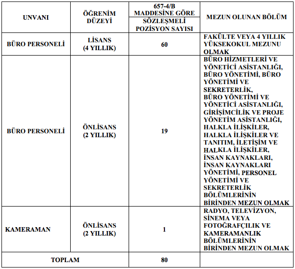 edilmek üzere 79 adet Büro Personeli ve 1 adet Kameraman pozisyonları için toplam 80 adet, taşra teşkilatında istihdam edilmek üzere 239 adet Büro Personeli ve 16 adet Sosyal Çalışmacı pozisyonları için toplam 255 adet sözleşmeli personel alımı yapılacaktır.