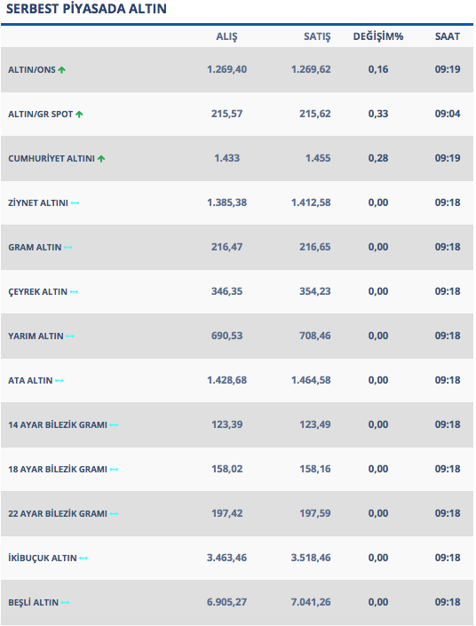 Gram altının satış fiyatı ise 215,55 TL oldu. Yatırım için tercih edilen altınlardan olan Cumhuriyet altını 1.425,00 TL’den alınırken, 1.447,00 TL’den satılıyor. İşte altındaki son durum: