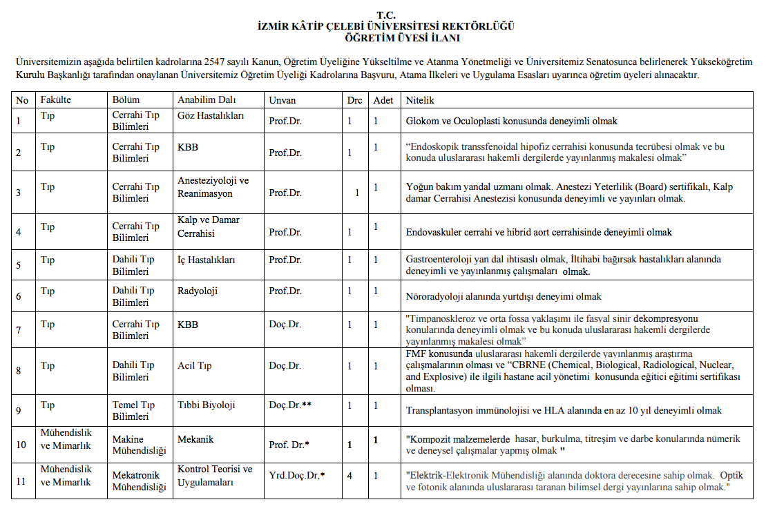 İzmir Katip Çelebi Üniversitesi kendi bünyesinde istihdam etmek üzere öğretim üyesi alımı yapacak.