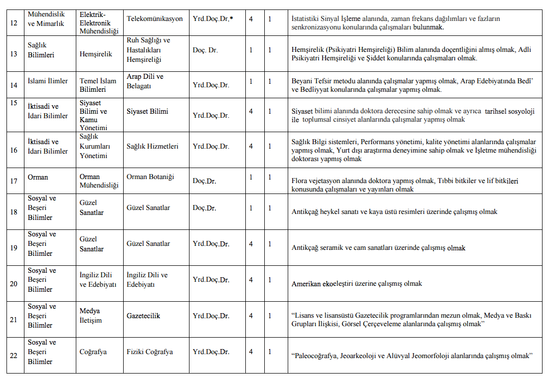 Üniversitemizin aşağıda belirtilen kadrolarına 2547 sayılı Kanun, Öğretim Üyeliğine Yükseltilme ve Atanma Yönetmeliği ve Üniversitemiz Senatosunca belirlenerek Yükseköğretim Kurulu Başkanlığı tarafından onaylanan Üniversitemiz Öğretim Üyeliği Kadrolarına Başvuru, Atama İlkeleri ve Uygulama Esasları uyarınca öğretim üyeleri alınacaktır.