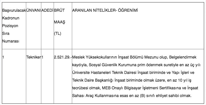Üniversitemizde istihdam edilmek üzere, giderleri Döner Sermaye Bütçesinden karşılanmak suretiyle, 657 sayılı Devlet Memurları Kanununun 4. maddesinin (B) fıkrasına göre, 06.06.1978 tarihli ve 7/15754 sayılı Kararnameye ekli 28.06.2007 tarih ve 26566 sayılı Resmi Gazetede yayımlanan Sözleşmeli Personel Çalıştırılmasına İlişkin Esaslarda Değişiklik Yapılmasına Dair Esaslar'da yer alan ek 2. maddenin (b) fıkrasına uyarınca, 2014 KPSS (B) grubu, Ön Lisans Mezunları KPSSP93 puan sırası esas ajınmakşuretiyje 1 (bir) sözleşmeli Tekniker alınacaktır.
