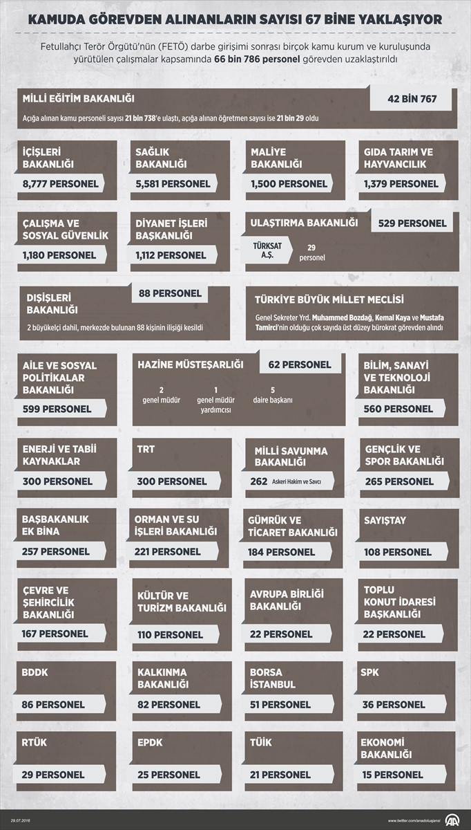 Fetullahçı Terör Örgütü'nün (FETÖ) darbe girişimi sonrası birçok kamu kurum ve kuruluşunda yürütülen çalışmalar kapsamında yaklaşık 67 bin personel görevden uzaklaştırıldı.
