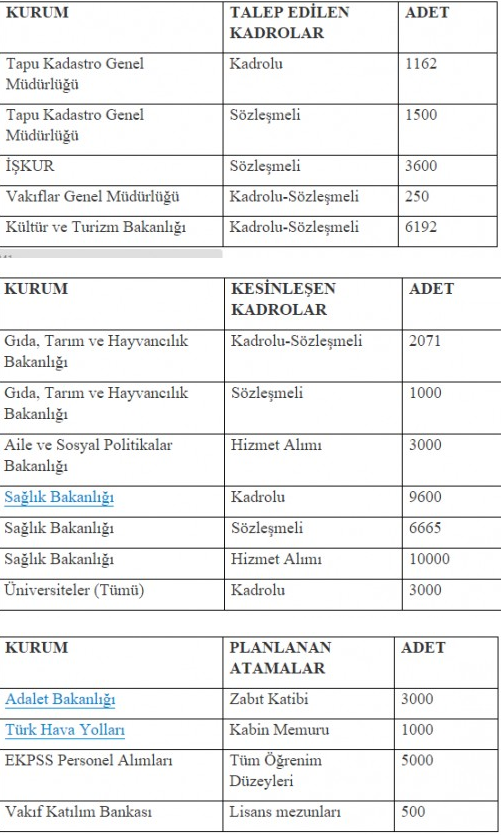 Şimdiye kadar 35 bin 336 kesinleşen kadro olmakla beraber, 12 bin 704 talep edilen ve 9 bin 500 planan atama bulunuyor. Birçok kurumda personel açığı var, kurumlar bu açıkları ek atama izinleriyle kapatmaya çalışacak. Kurumların 2016’da talep ettiği kadrolar ve atama izni verilen personel alım sayıları şöyle: