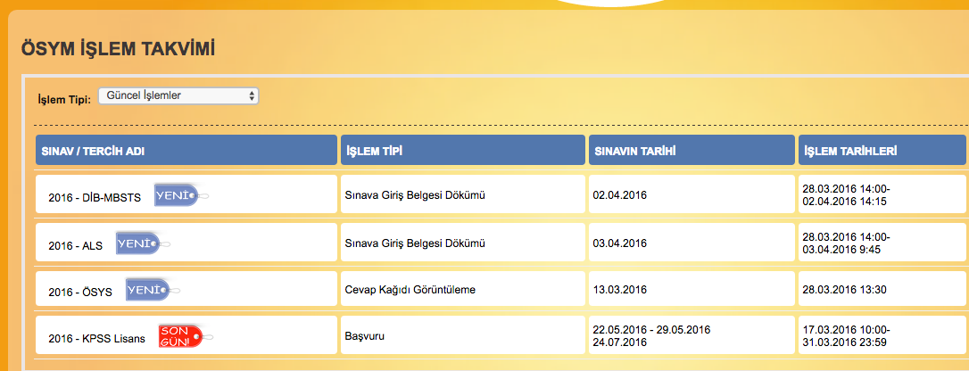 2016 Kamu Personel Seçme Sınavı (KPSS) lisans düzeyinde 22 Mayıs 2016 ve 29 Mayıs 2016 tarihlerinde, sabah ve öğleden sonra uygulanacak. Öğretmenlik Alan Bilgisi Testi (ÖABT), MEB öğretmen atamalarına katılacak öğretmen adayları için alanlarına bağlı olarak 24 Temmuz 2016 tarihinde yapılacak. Diyanet İşleri Başkanlığında din hizmetlerinde görev almak isteyenlerin katılacakları Din Hizmetleri Alan Bilgisi Testi (DHBT), 6 Kasım 2016 tarihinde yapılacak.