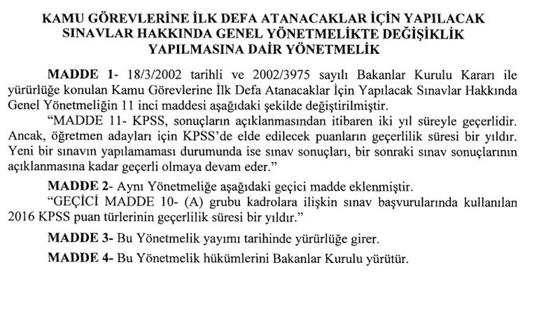 Yeni hükme göre KPSS, sonuçların açıklanmasından itibaren iki yıl süreyle geçerli olacak. Ancak, öğretmen adayları için KPSS’de elde edilecek puanların geçerlilik süresi bir yıldır. Yeni bir sınavın yapılamaması durumunda ise sınav sonuçları, bir sonraki sınav sonuçlarının açıklanmasına kadar geçerli olmaya devam edecek.