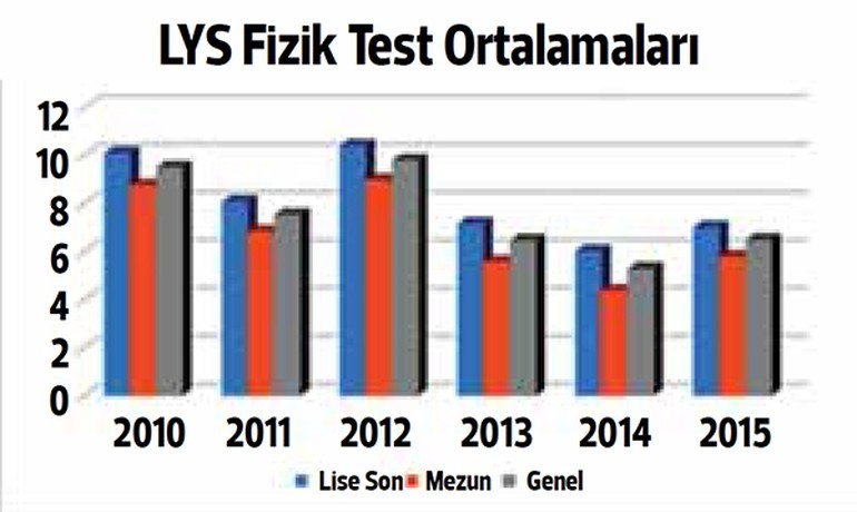 LYS fizik testinde 30 olan soru sayısı yıllardır değişmedi ancak 2010'dan beri test ortalaması geriledi.