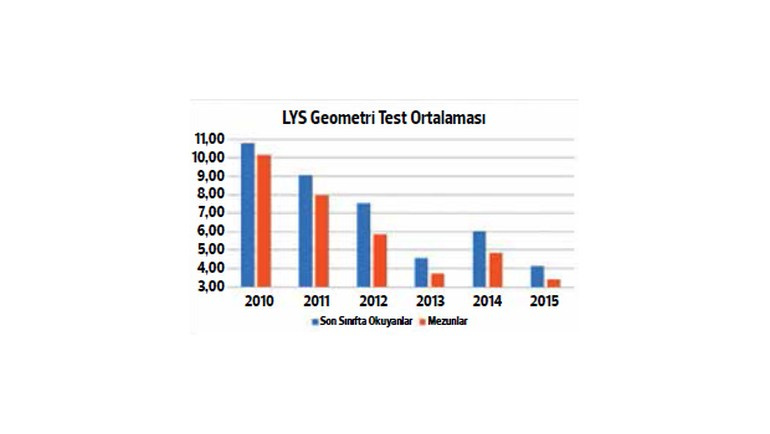 Lisans Yerleştirme Sınavları'nın (LYS) geometri testinde 30 soru bulunuyor ancak genel ortalama 2010 yılında 10.5 iken 2015 yılında 3.8'e kadar geriledi.