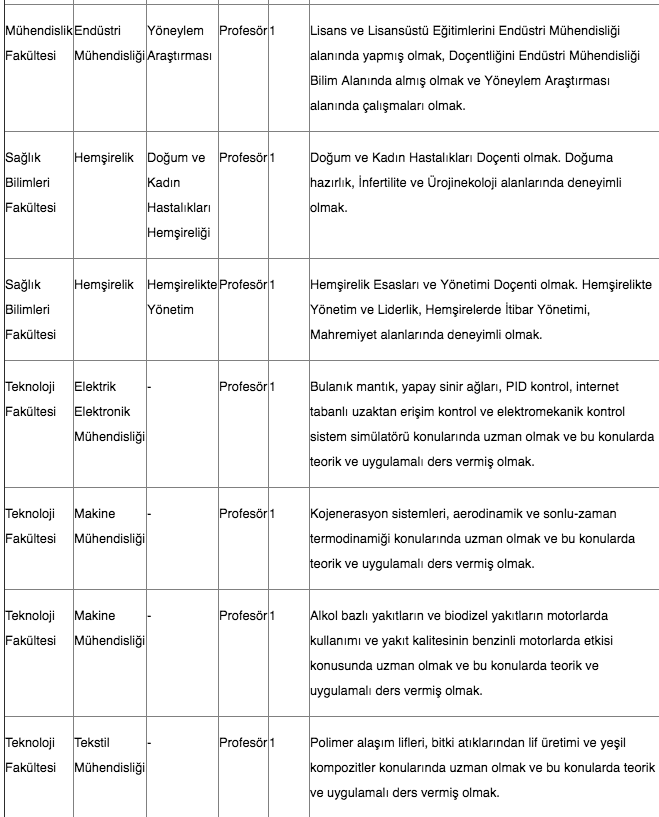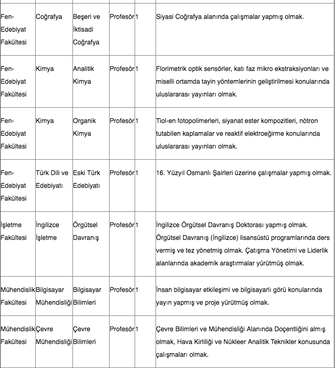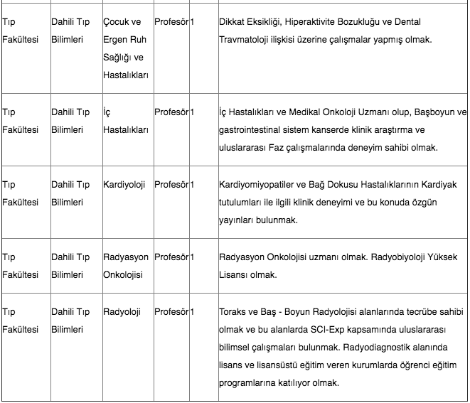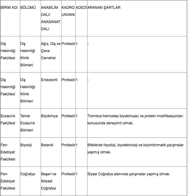 Üniversitemiz Diş Hekimliği Fakültesi, Eczacılık Fakültesi, Fen-Edebiyat Fakültesi, İşletme Fakültesi, Mühendislik Fakültesi, Sağlık Bilimleri Fakültesi, Teknoloji Fakültesi, Tıp Fakültesi'ne aşağıda belirtilen Bölüm ve Anabilim Dallarına 2547 sayılı Kanunun ve Öğretim Üyeliğine Yükseltme ve Atanma Yönetmeliğinin ilgili maddeleri uyarınca, Üniversitemiz Öğretim Üyeliğine Yükseltilme ve Atanma Kriterlerini sağlamış olmak koşuluyla Profesör alınacaktır.